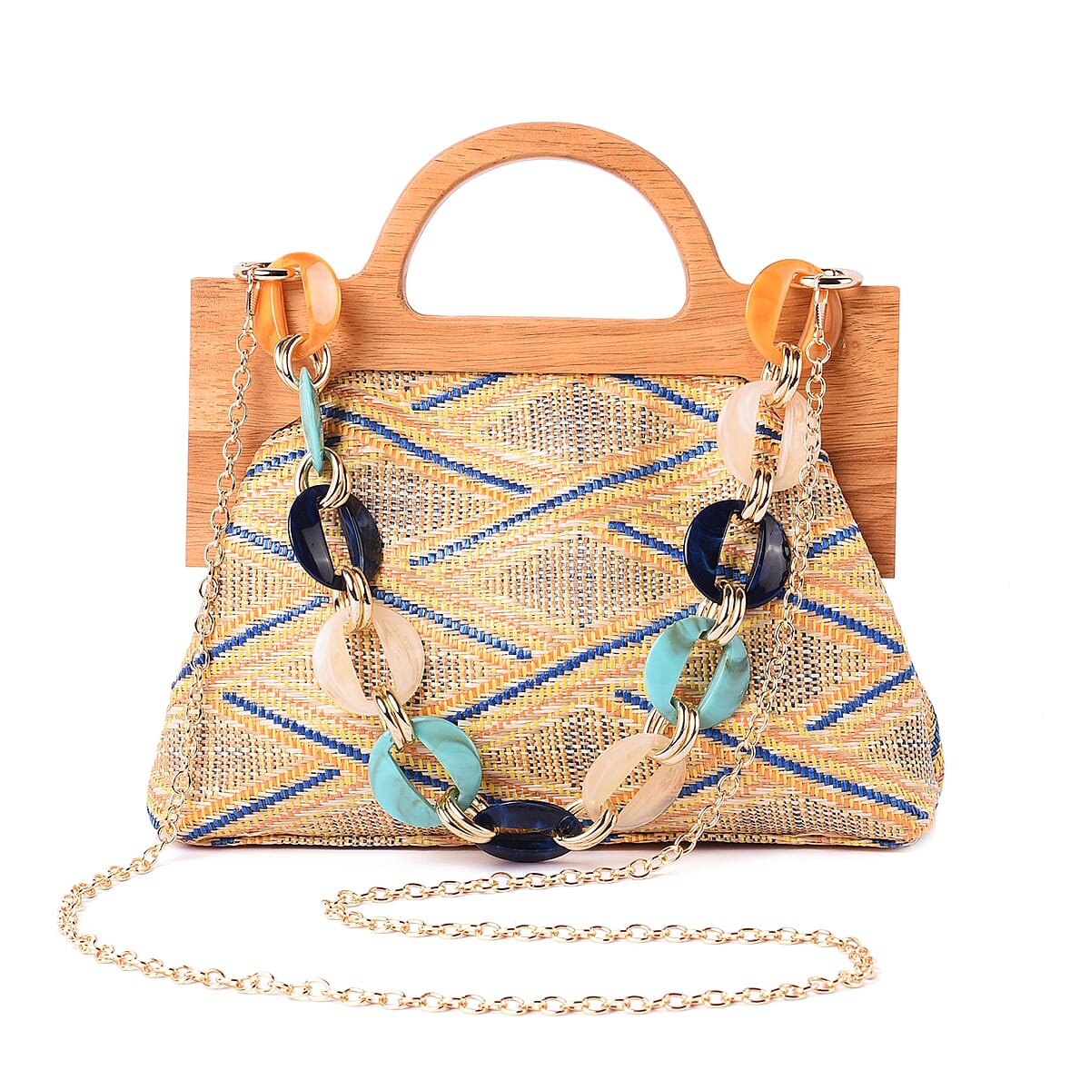 Yellow Lattice Pattern Woven Clutch Bag with Wooden Handle Drop & Magnetic Closure