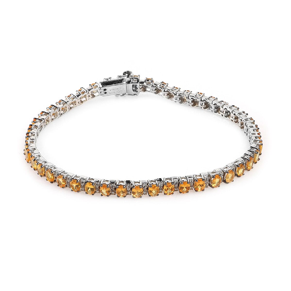 The Sun is an inspiration for this yellow scapolite and white zircon bracelet. Round yellow scapolites and zircons are embellished alternatively in the bracelet's frame. This tennis bracelet is framed in sterling silver with a platinum finish to enhance the vibrant yellow hues of the gemstone. The yellow scapolite's sturdiness, transparency and hardness make it a rare gemstone. This yellow bracelet is secured with a tab insert clasp. The yellow scapolites exude extraordinary gleam.