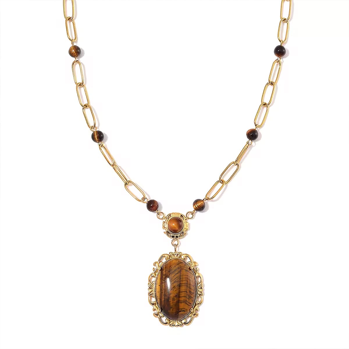 Yellow Tigers Eye 14.00 ctw Necklace in ION Plated Yellow Gold Stainless Steel 20-22 Inches