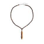 A. The necklace features tiger's eye beads, selected for their distinctive patterning and polished finish that adds depth and character to men's styling.