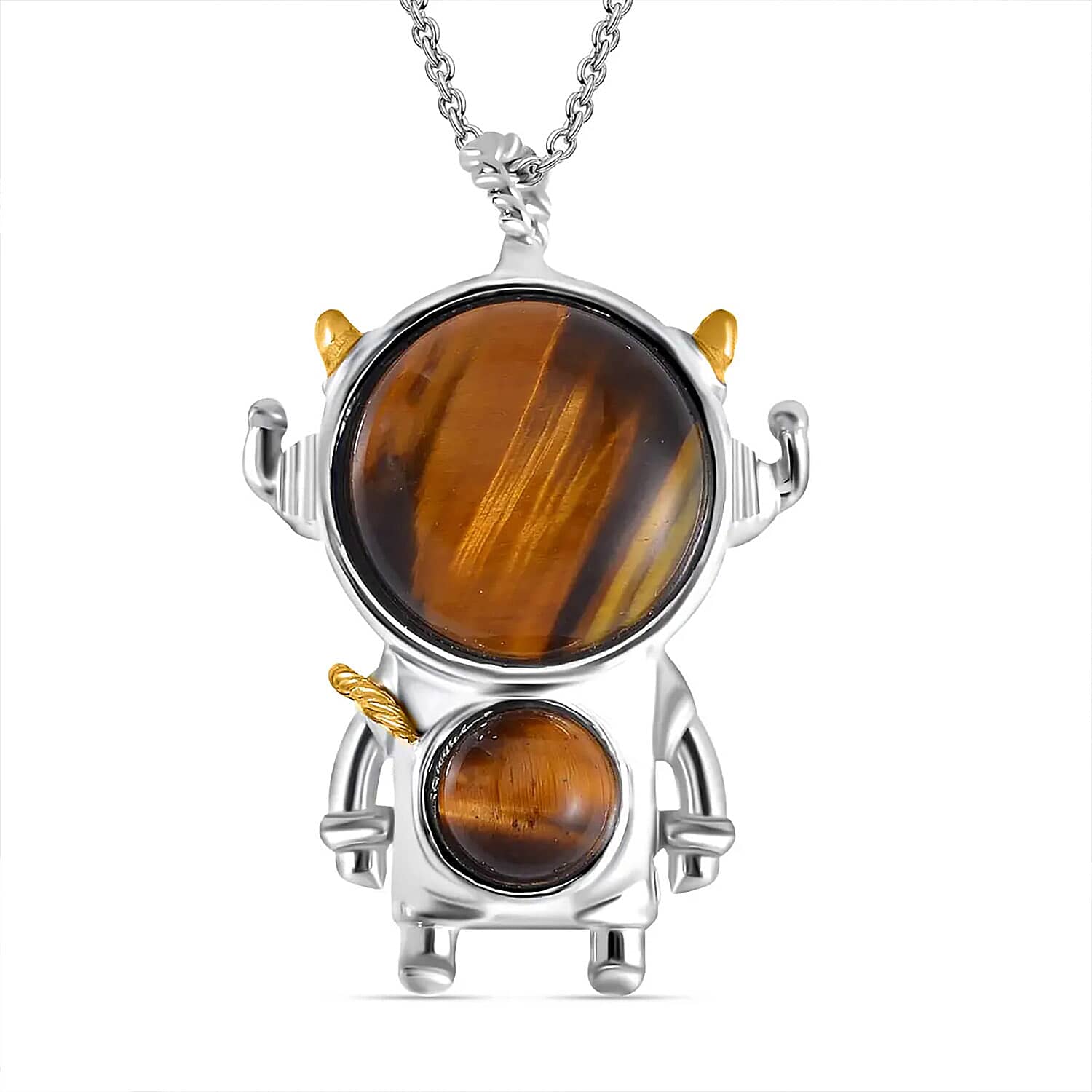 Yellow Tigers Eye 46.50 ctw Spaceman Pendant in Dualtone with Stainless Steel Chain 24 Inches
