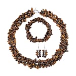 Yellow Tiger's Eye Chips Stretch Bracelet and Earrings and Toggle Clasp Necklace (18.00 In) in Black Oxidized Stainless Steel 928.15 ctw