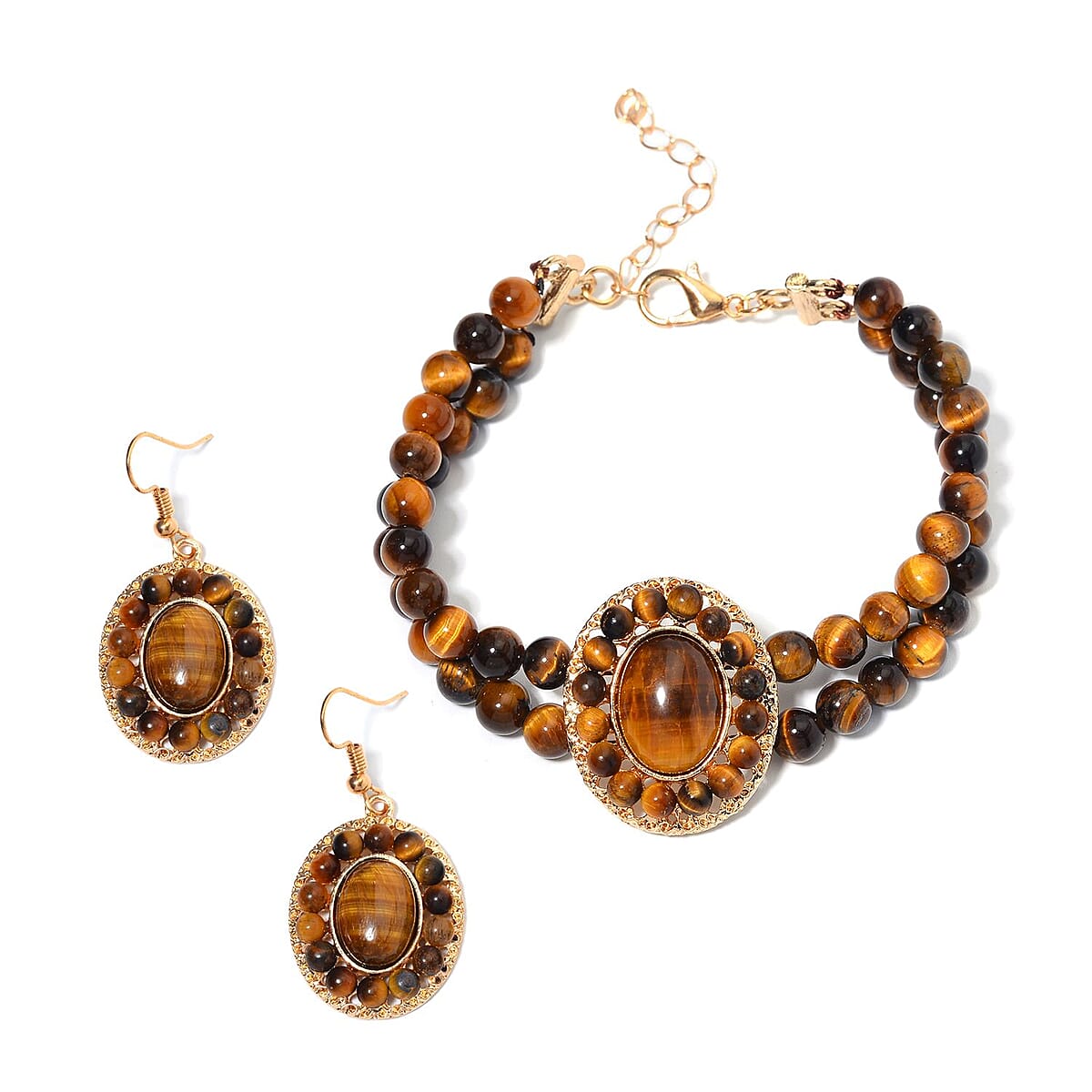 Yellow Tiger's Eye Halo Dangle Earrings and Double Row Bracelet (8.0-10.0In) in Goldtone 140.60 ctw