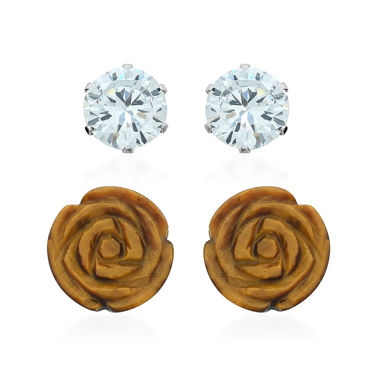 Yellow Tiger's Eye, Simulated Diamond Set of 2 Stud Earrings in Stainless Steel 8.40 ctw | Tarnish-Free, Waterproof, Sweat Proof Jewelry