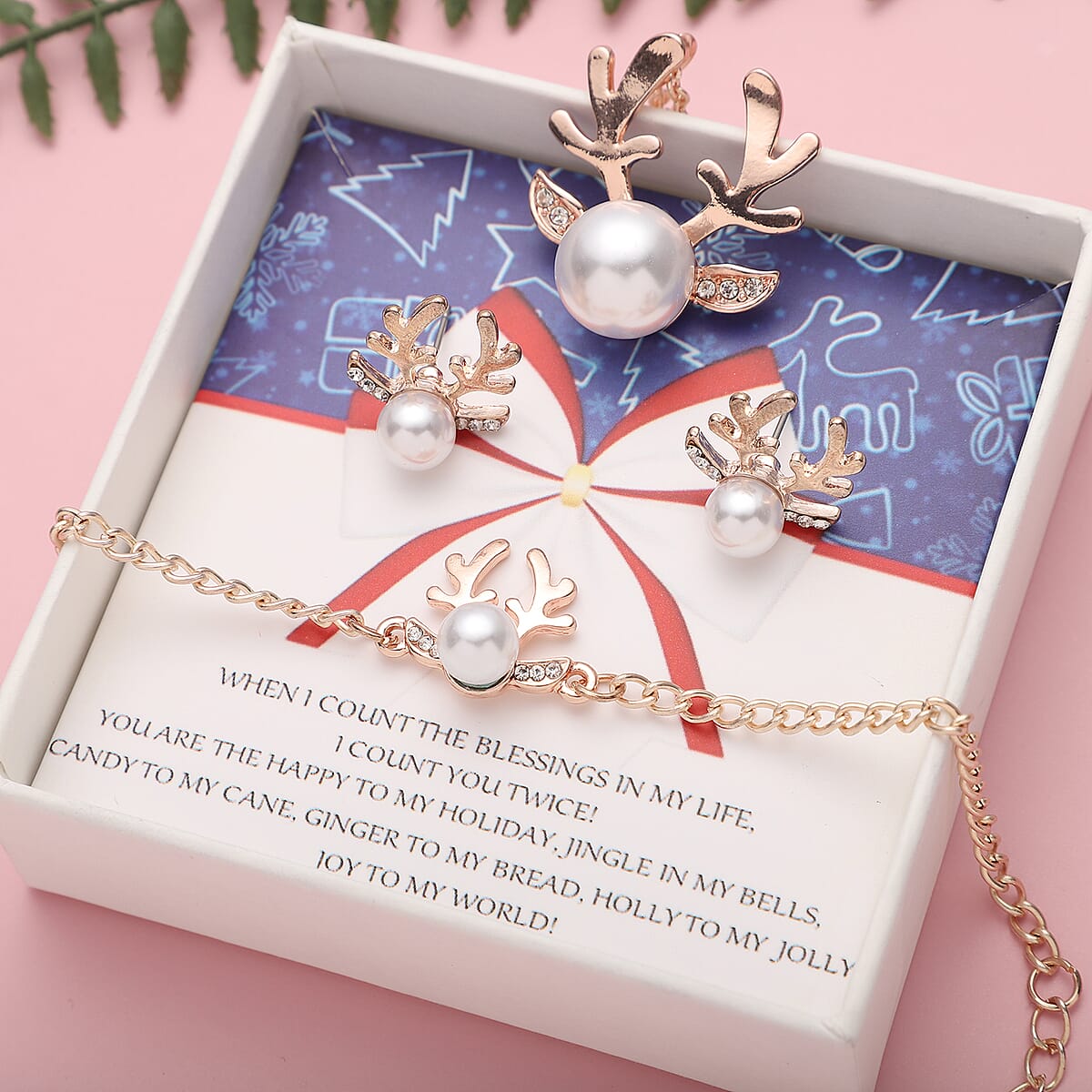 You are My Blessing Jewelry Gift Box with White Shell Pearl Christmas Reindeer Necklace 20 Inches Bracelet (7in) and Earrings in Rosetone