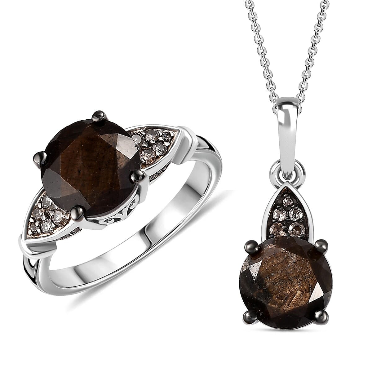 Zawadi Chocolate Sapphire and Champagne Zircon Ring (Size 6.0) and Pendant Necklace 20 Inches in Rhodium Over Sterling Silver 6.00 ctw